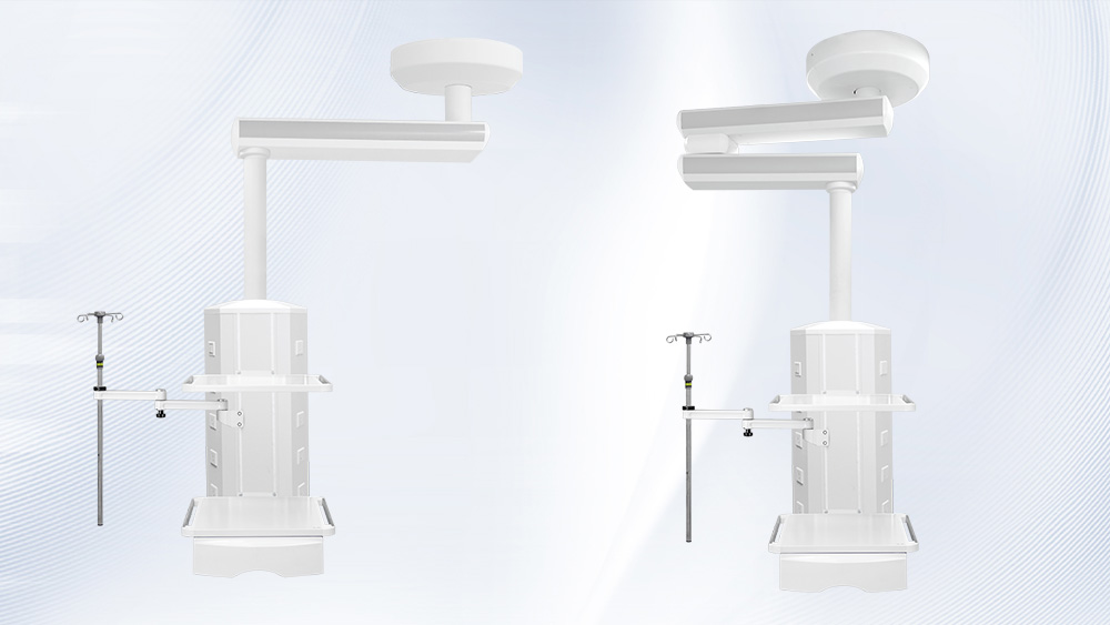 从底座的外观上看,医用挂件可分为单挂件、双挂件或其他组成形式,也可分为单臂和双臂。底座上安装一个或两个吊塔。一般称为医用吊塔。手术室和ICU一般需要双塔。在ICU病房中,双挂件的使用更为广泛,特别是在一些隔离病房或房间面积稍大的贵宾室。与费普顿吊桥一样,双塔也可以通过两个吊塔有效地分离干湿。两个吊塔中的一个作为湿区安装输液泵、注射泵、氧流量计、负压吸引器等液体通过设备及相应的供给,另一个塔作为干区安装监护仪、呼吸机、一次性耗材等,使干湿区完全分离,对ICU患者的护理管理变得安全可靠。此外,这两种吊塔比医用吊桥移动更方便,悬臂系统既可以像费普顿医疗吊桥一样水平定位,也可以垂直定位。这样,患者头部区域的空间更大,吸氧、吸痰等常规护理更安全、更方便。