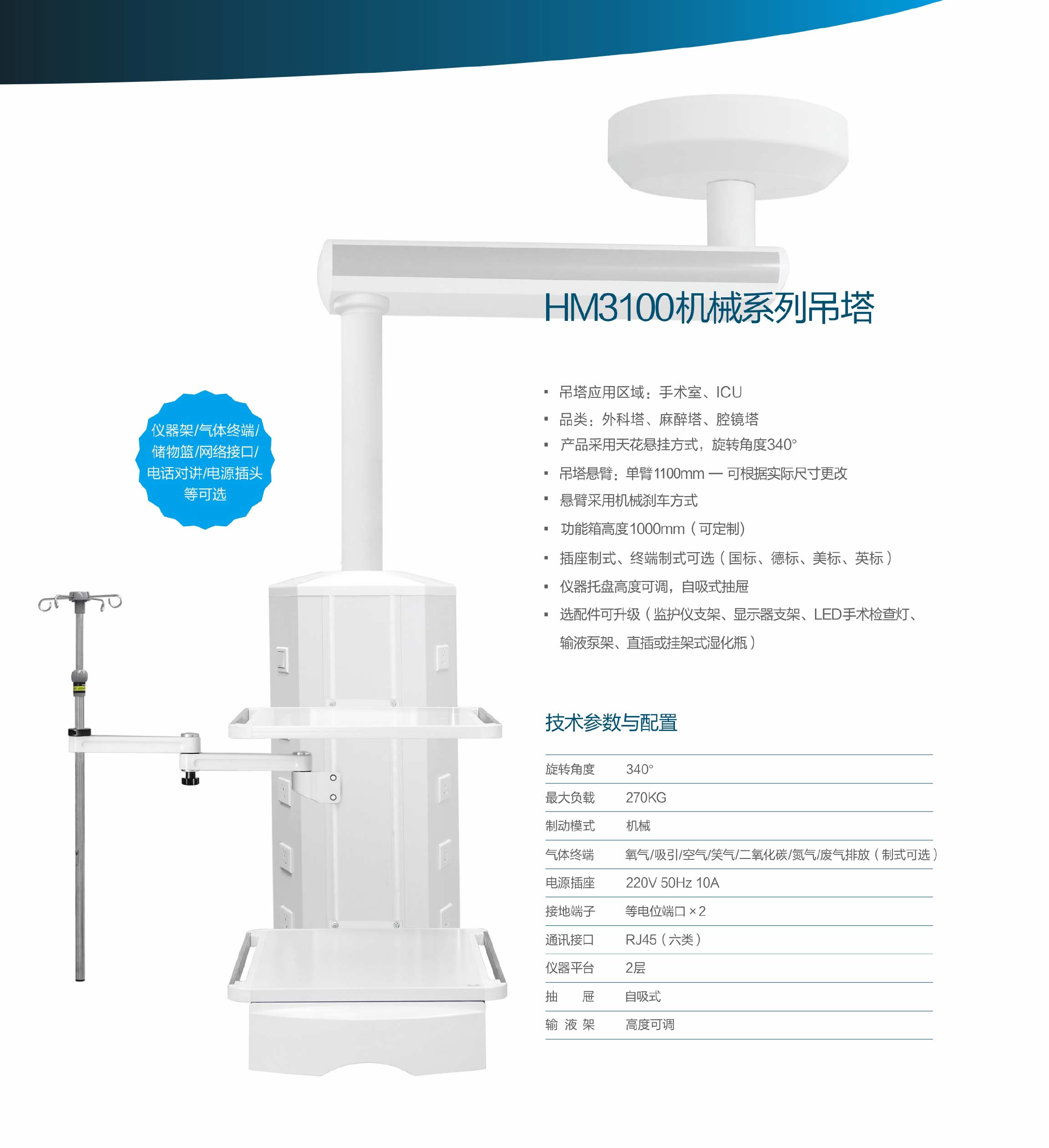 吊塔应用区域:手术室、ICU产品采用天花悬挂方式,旋转角度340°